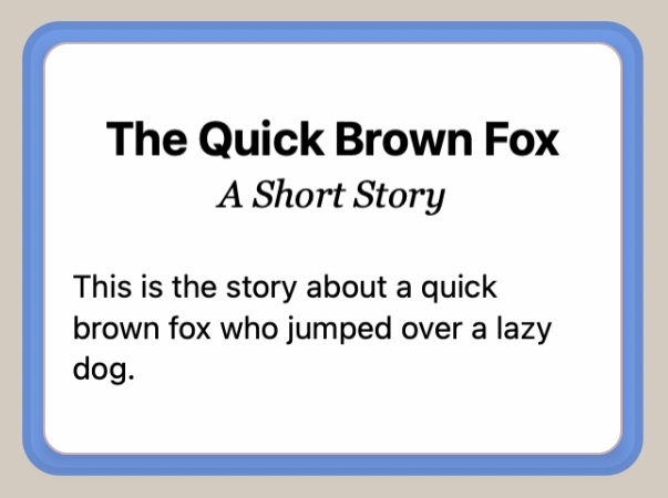 Auto-style is a great way to quickly formatting text that has a heading and body text. When this formatting is chosen for a card, the first line of text will be formatted in a heading style. If there is a line of text immediately following it, it will be styled as a sub-title to the heading. (You may leave the line after the heading line blank if you don’t want sub-title.) The rest of the lines following will be styled a regular body text.